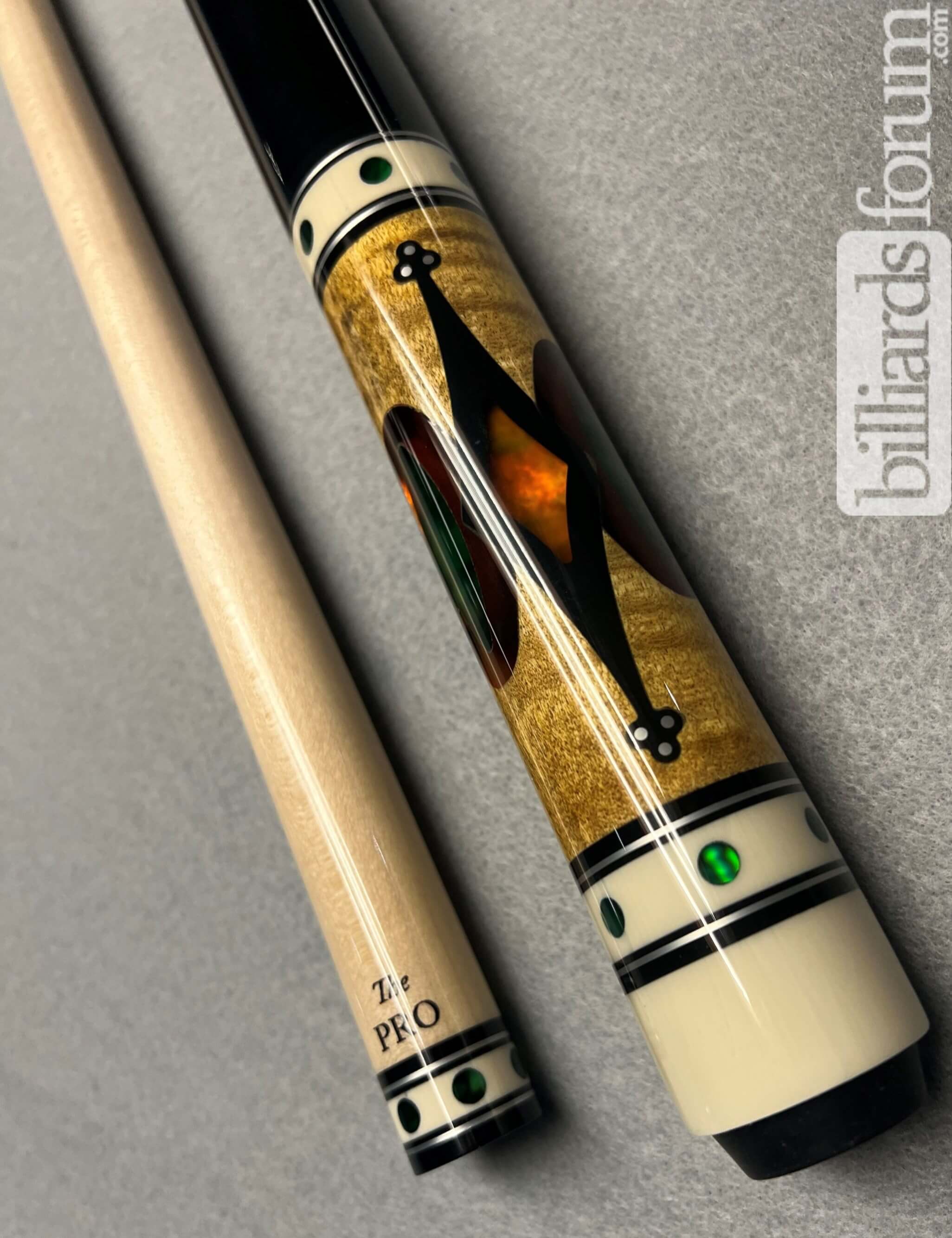 Photo of a BMC Curly Hornet pool cue with matching "The Pro" shaft.