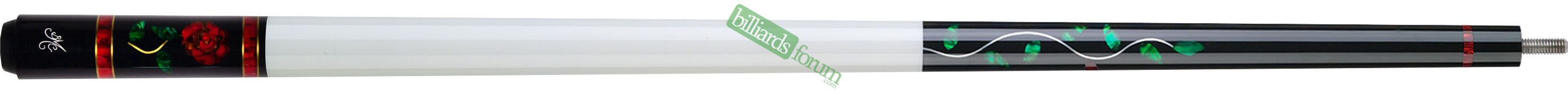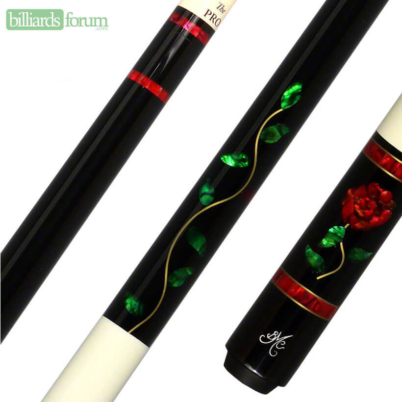 Meucci Glass Rose Bob Meucci pool cue. This cue has a black forearm with two inlaid rose designs. The forearm rose design has a brass stem with green paua shell leaves and a red paua shell for the rose. The butt sleeve has an inlaid rose design with a brass stem with green paua shell leaves and red and orange paua shell for the rose petals. Other features include custom red pearl and brass ring work on butt sleeve and joint collars. Completing the cue is a Urethane coated white Isiah linen wrap, black butt cap, and a Meucci "The Pro" shaft.