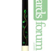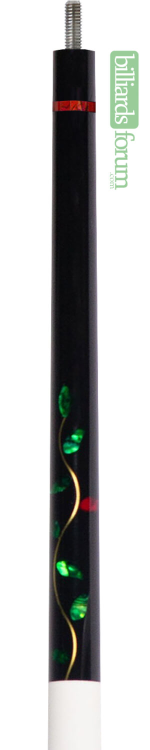 | Forearm: | The forearm of the the BMC Rose cue consists of a brass vine protruding from the wrap with multiple paua shell leaves and a red mirrored rose bud to complete the design. This design is on both sides of the forearm. The shaft and butt joint are wrapped with a ring consisting of 24 separate pieces of paua shell to complete this glass design. |