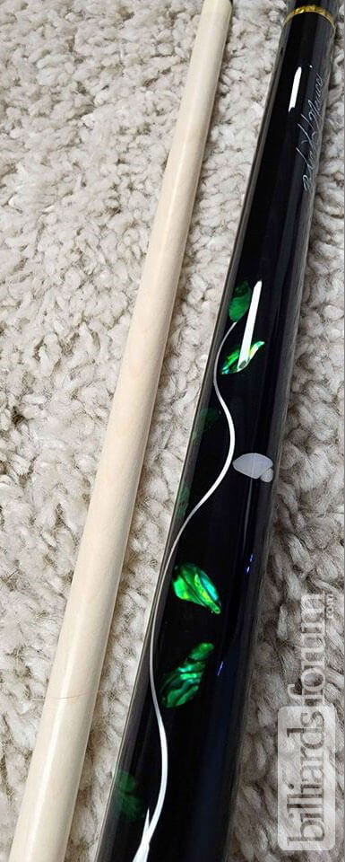 | Forearm: | The forearm of the the BMC Rose cue consists of a silver vine protruding from the wrap with multiple paua shell leaves and a yellow mirrored rose bud to complete the design. This design is on both sides of the forearm. The shaft and butt joint are wrapped with a ring consisting of 24 separate pieces of paua shell to complete this glass design. |