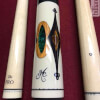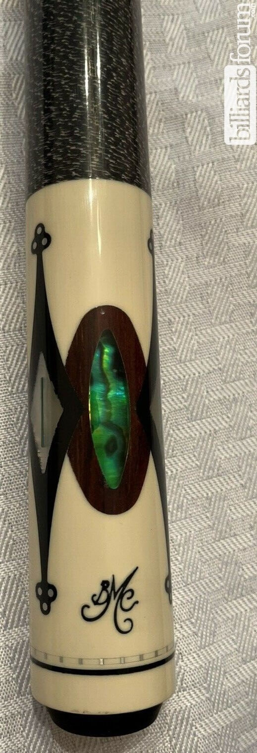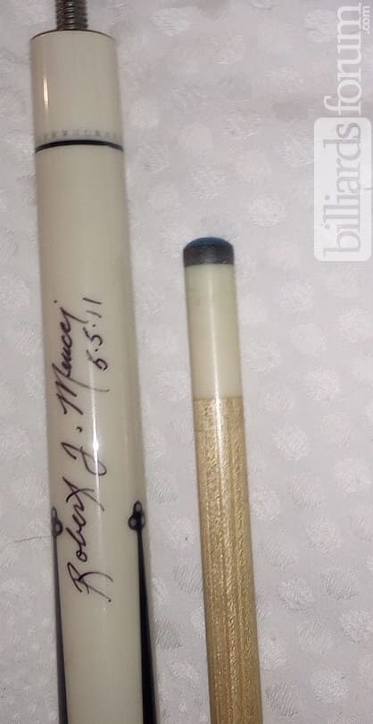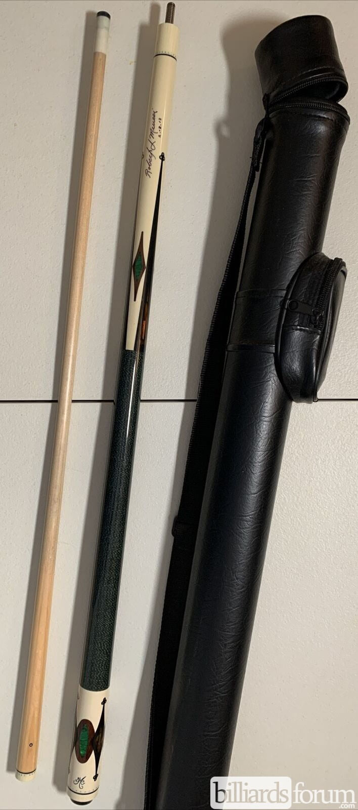 A BMC Green Hornet cue that was for sale in the past. The cue is dated 2012-05-01 and signed "Robert Meucci" on the forearm. From the seller: I bought this cue used. I’ve never used the original shaft. Shaft rolls straight by itself, and when connected to the butt. The butt has a few scratches in the clear coat and one small chip at the end (see photos). It is a great playing cue.