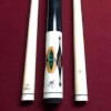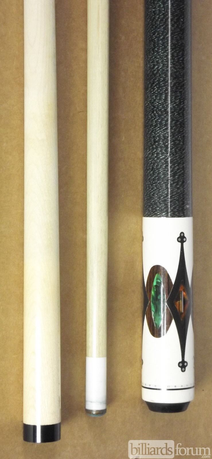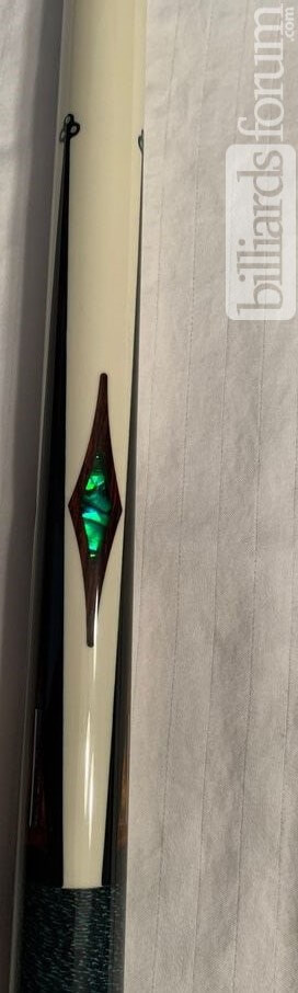 A BMC Green Hornet Pool Cue that was for sale at Boynton Billiards in 2011. From the seller: Up for auction is a brand new Bob Meucci Custom Pool cue model"Green Hornet" (unchalked) with Meucci Black Dot shaft 35 layer shaft (12.6mm) 4.6oz with LBM ferrule, triangle tip (new and unchalked). Black and Green linen wrap (clear over it) and weighs 18.9oz (weight can be changed). Forearm is White over maple (14.3oz), 3 black points with clover leaf inlays, Bacote diamond inlays with green. Butt sleeve is White over maple with Bacote diamond inlays with green. clover leafs on top of each diamond. Butt cap is white phenolic with BMC logo. Cue is signed and dated. This is a great players cue!