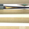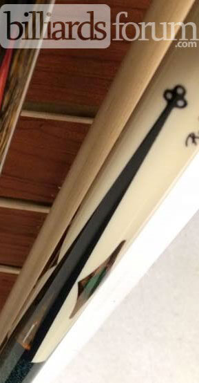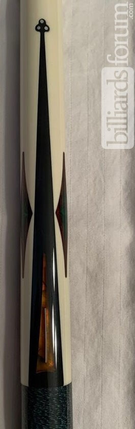 All three points in the forearm, and all three diamonds in the butt sleeve, have clover finals inlaid with three aluminum centers in each, nine places in all. The cue is wrapped with black Irish linen wrap.