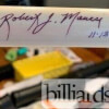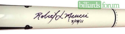 Photo of a BMC Green Hornet pool cue, showing the date and signature of Robert J. Meucci.