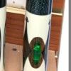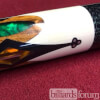 | Butt Sleeve: | Three black diamonds with gold paua shell inlaid in the center, set off with vertical aluminum lines. These diamonds overlap three cocobolo ovals, each with a green paua shell oval in its center. All three points in the forearm, and all three diamonds in the butt sleeve, have clover finals inlaid with three aluminum centers in each, nine places in all. |