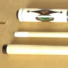 A BMC Green Hornet Pool Cue. Butt sleeve is White over maple with Bacote diamond inlays with green clover leafs on top of each diamond. Butt cap is white phenolic with BMC logo.