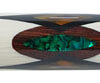 | Forearm: | Three black points in the forearm, with three cocobolo diamonds in between each point. Inlaid in the center of the cocobolo diamonds are beautiful green paua shell diamonds. In the center of each black point is a copper paua shell fluted triangle, set off with an aluminum vertical line. |