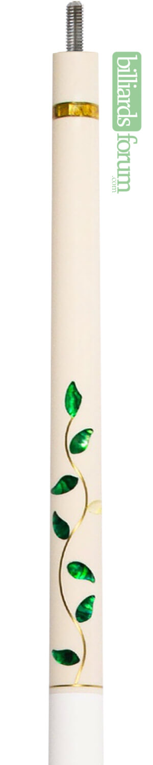 | Forearm: | The forearm of the the BMC white Rose cue consists of a brass vine protruding from the wrap with multiple paua shell leaves and a yellow mirrored rose bud to complete the design. This design is on both sides of the forearm. The shaft and butt collars are wrapped with a ring consisting of 24 separate pieces of paua shell to complete this glass design. All set it a white background. |