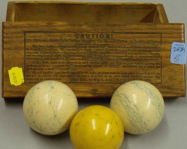 Three Boxed Ivory Billiard/Pocket Balls, in a Brunswick-Balke-Collender Co. wooden box with label.
