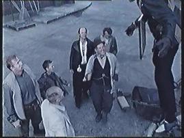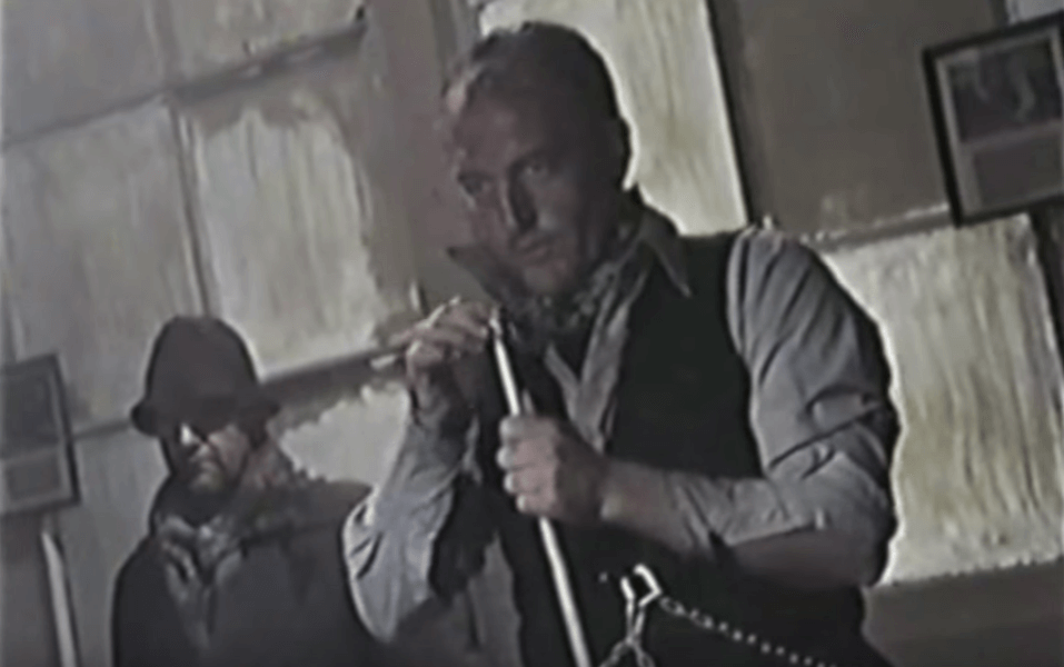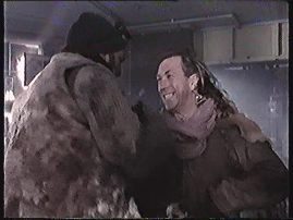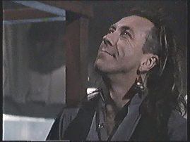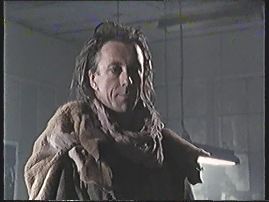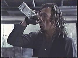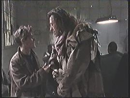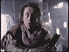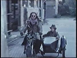 Eventually he arrives at an almost empty bar which turns out to be an old haunt of his. The only two occupants, a barman called Max (very original) and a kid called Eddy are busy watching a video. The electricity is supplied by Eddy's hard work on a pedal-powered generator. Great exercise! Eddy and Max, just like the majority of people in the film, are also dressed like tramps. Harry and Max turn out to be old friends and they both seem happy to see each other.