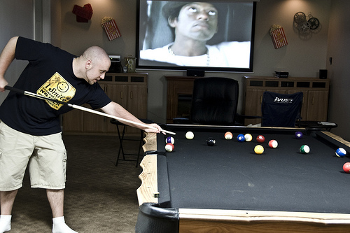 The billiard room photo titled "Billiard Room Home Theatre" was taken by pir8. on 2008-05-23 18:04:16.000 and uploaded to flickr on 2008-05-28 18:04:16.000. It was retrieved from a public flickr feed on 2008-05-29 05:34:27.000. The accompanying article was written and published by the Billiards Forum. The publish date of the text content is found below.