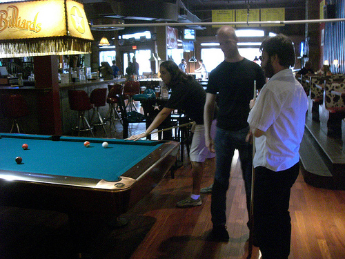 Here is another shot of our billiard hall in an Austin Texas bar from the 2008 4th of July. Good spacing around this pool table, yet still close enough to the bar to be able to sneak away for a quick pop between innings. The table looks like a coin operated pool table.