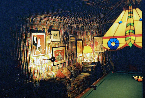 Here is the home billiard room of the great singer songwriter Elvis Presley in his Graceland mansion. There is no way one could possibly concentrate in this room with it's matching fabric walls and ceiling. I'm also not a fan of the stained glass pool table lamp either.
