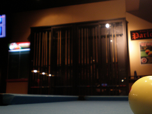 This is a great shot, though a little blurry, of an amazing pool cue rack. It is probably a commercial billiard cue rack, but it is really nice. It has glass doors so it would even be good to showcase some antique pool cues. The table in the foreground seems to have one of the cue balls with the red dots used for shot training.