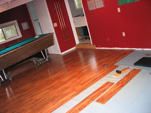 The thing I like the most about this billiard room pictures cue rack hanging on the wall by the door. It's enough for three queues, which is generally all home billiard player would typically have. It centered perfectly on the wall and just the right height. I think it's the perfect contrast for that crazy dark red color. In this home billiard room remodel we conceive the owners are still weighing laminate floor, and that the pool table is still up on those dollies from moving around.
