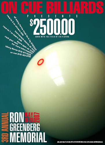 This is a poster for the 3rd annual On Cue Billiards Ron Greenberg Memorial. I like this poster as it is very well designed. Ashi Fachler is the designer, so kudos Ashi.