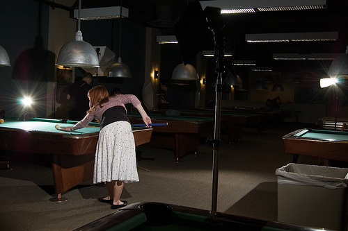 Here is another shot of a photo shoot in a drab, but spacious pool room at the University of Oregon. I hate the lights, hate the floor, (although kudos for the low industrial carpet) and love the spacious layout. Click back or forward, there are a few more photos of this room.