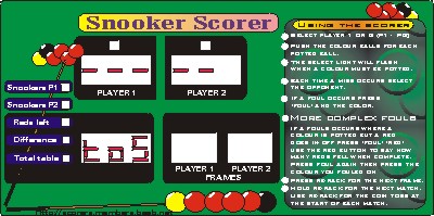 The Snooker Scorer, by Geoff Hackett is an electronic digital snooker scoreboard with remote control. (no longer available)