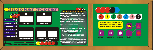 The snooker score board is designed for clubs and pubs and is programmed with English and international snooker rules.