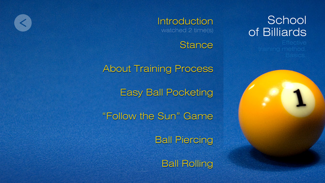 The School of Billiards iPhone app is intended for billiards players and those who have just started or about to start learning how to play the game. This application contains 1.5+ hours of instructional video, complete with theoretical explanation and practical demonstration of exercises. The video features an effective tried-and-true teaching method that performed extremely well at billiards schools and was successfully used for individual training lessons.