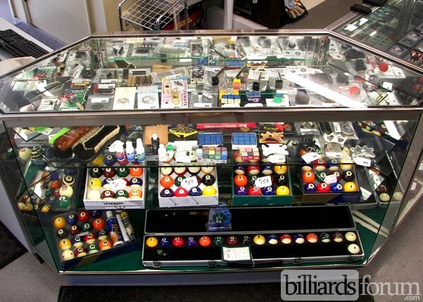 The billiard accessories display area inside of Ac-Cue-Rate Billiards in Pelham, NH.