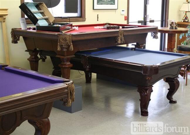 The billiard table sales area inside of Ac-Cue-Rate Billiards in Pelham, NH.
