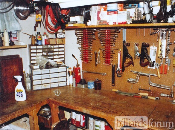 The billiard service team from Ac-Cue-Rate Billiards in Pelham, NH is the best in the area. Knowledge comes from the founder, Bob Quenneville. Shown here is his billiard service work bench.