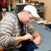 The billiard service team from Ace Game Room Gallery in Fort Wayne, IN working on putting new cloth on the rails for a pool table.