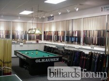 The used pool table area inside of Alkar Billiards & Barstools in Omaha, NE. Note the used Olhausen pool table for sale.