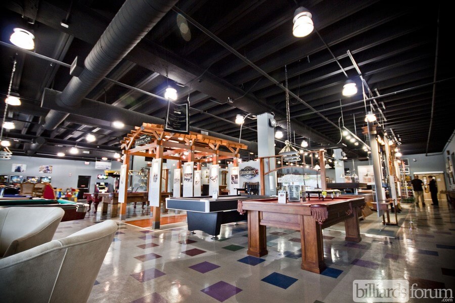 The pool table area inside of AMA Distributors in Metairie, LA. Note the Brunswick Billiards pool table pavilion.