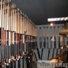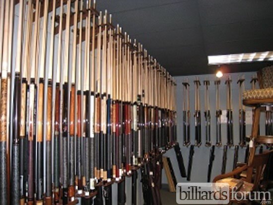 The pool cue selection at Apollo Pools & Billiards in Portland, OR.