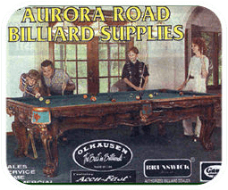 This is an ad from Aurora Road Billiard Supplies in Melbourne, FL showing artwork and logos from old Olhausen and Brunswick Billiards catalogs.