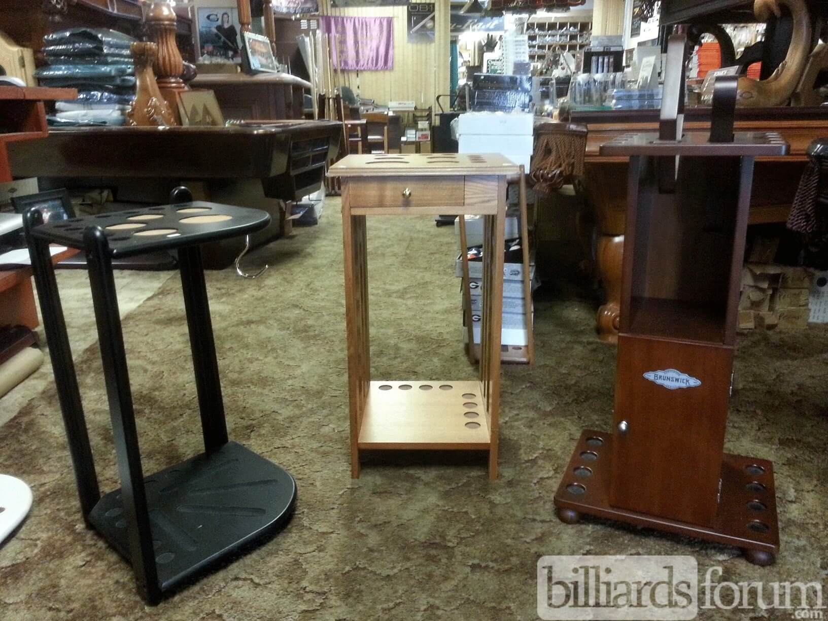 A selection of pool cue racks at Aurora Road Billiard Supplies in Melbourne, FL.