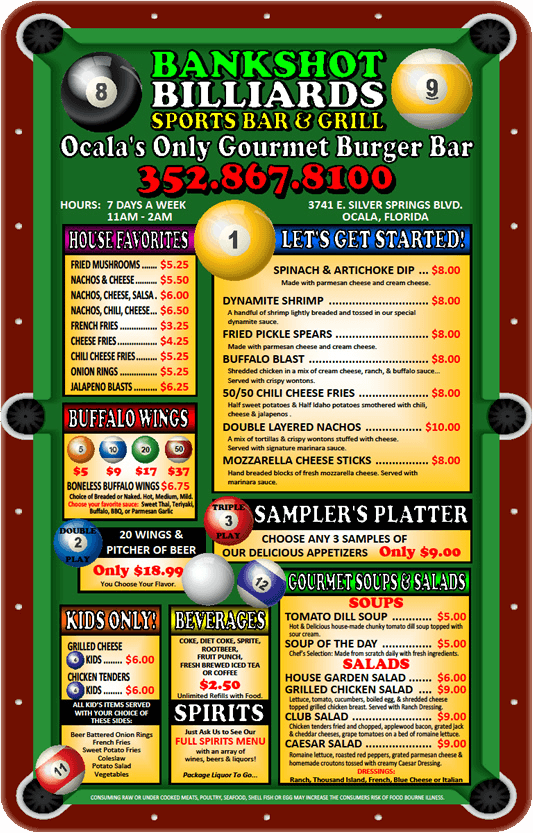 A flyer showing the menu from Bankshot Billiards Sports Bar & Grill in Ocala, FL.