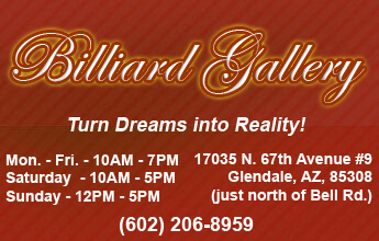 Welcome to Billiard Gallery, Arizona's Premiere Billiard & Game Room Furniture Showroom. Looking for a billiard table for that empty room? Pool tables are a great way to add entertainment and hours of fun for you and your guests. Choose from many different styles of billiard tables to match your furniture. Browse Online or visit our Phoenix, Arizona valley billiard showroom in Glendale.