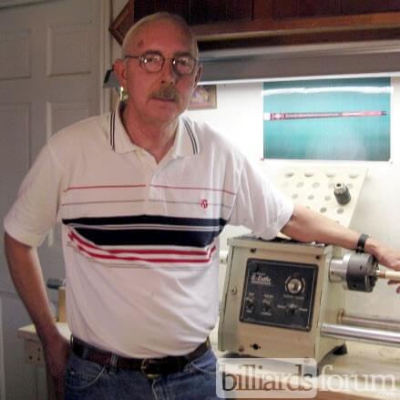 Bob Harris custom pool cue maker standing by one of his pool cue lathe benches inside of Bob Harris Custom Cues, a custom cue making outfit in Richmond, KY.