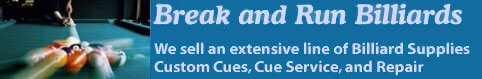 A banner from Break and Run Billiards based out of Nashua, NH, showing their slogan: "We sell an extensive line of billiard supplies, custom cues, cue service, and repair".