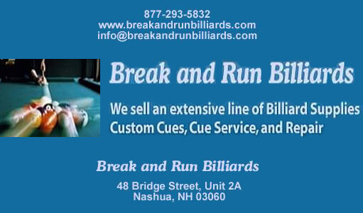 NOTE: Break and Run Billiards of Nashua, NH has converted into "The Total Gamester, Break & Run Billiards" (which is also no longer in business). Visit links below for details.