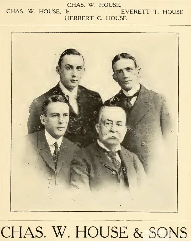 Charles House (front-right) with this three sons, Chas. W. House Jr., Everett T. House, and Herbert C. House. This picture is from the first pages of Chas. W. House & Sons first catalog from New York in 1905.
