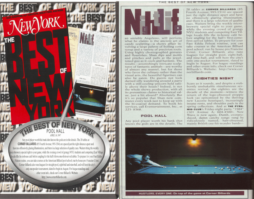 Past marketing materials, advertisements, flyers by Corner Billiards New York, NY.