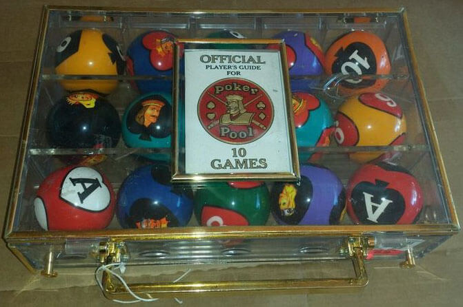 A set of poker pool balls from Crown Games Inc based out of Laguna Niguel, CA. Included is a carrying case, the poker pool balls, and a poker pool rule book.