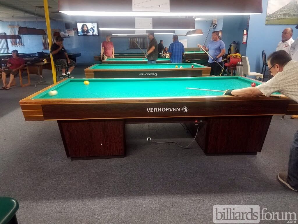 The Verhoeven carom billiard tables inside of Diamond Billiards, a pool hall in Garden Grove, CA.