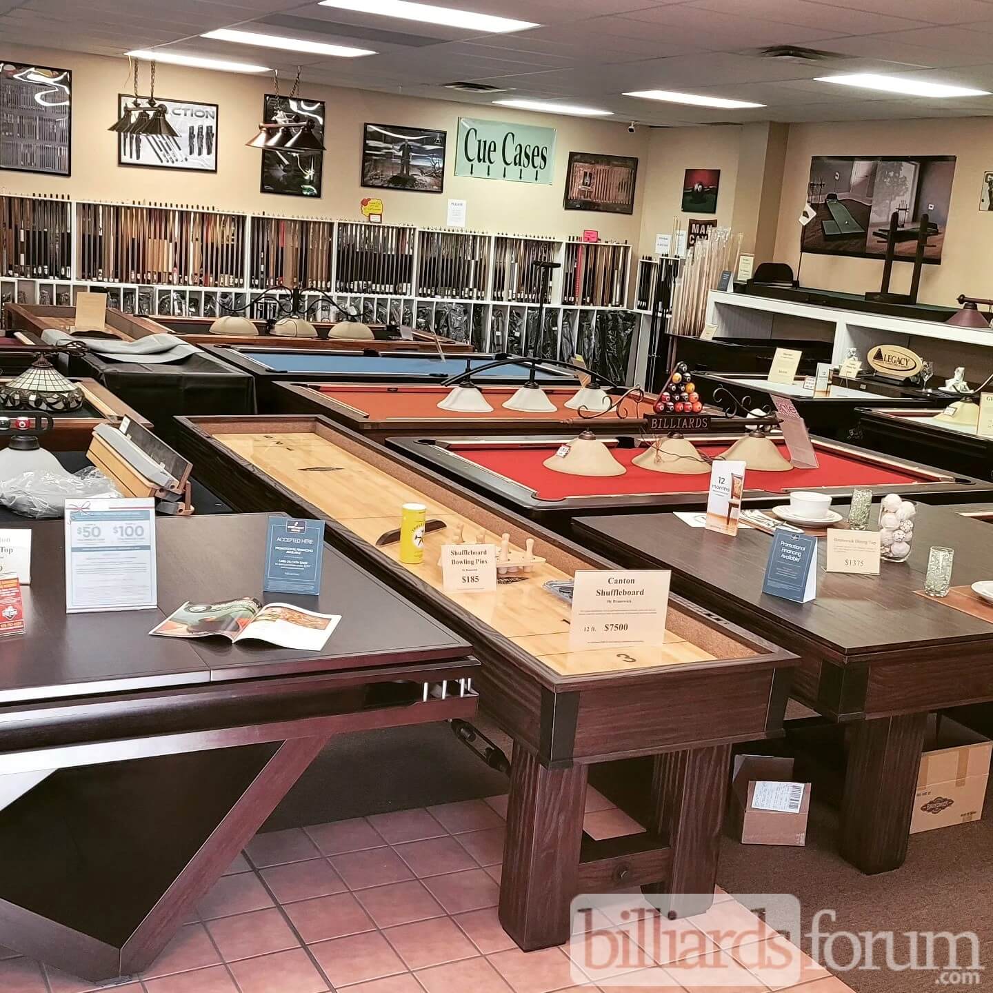 The showroom area inside of the Front Range Pool Table Co., a billiard supply store in Fort Collins, CO.