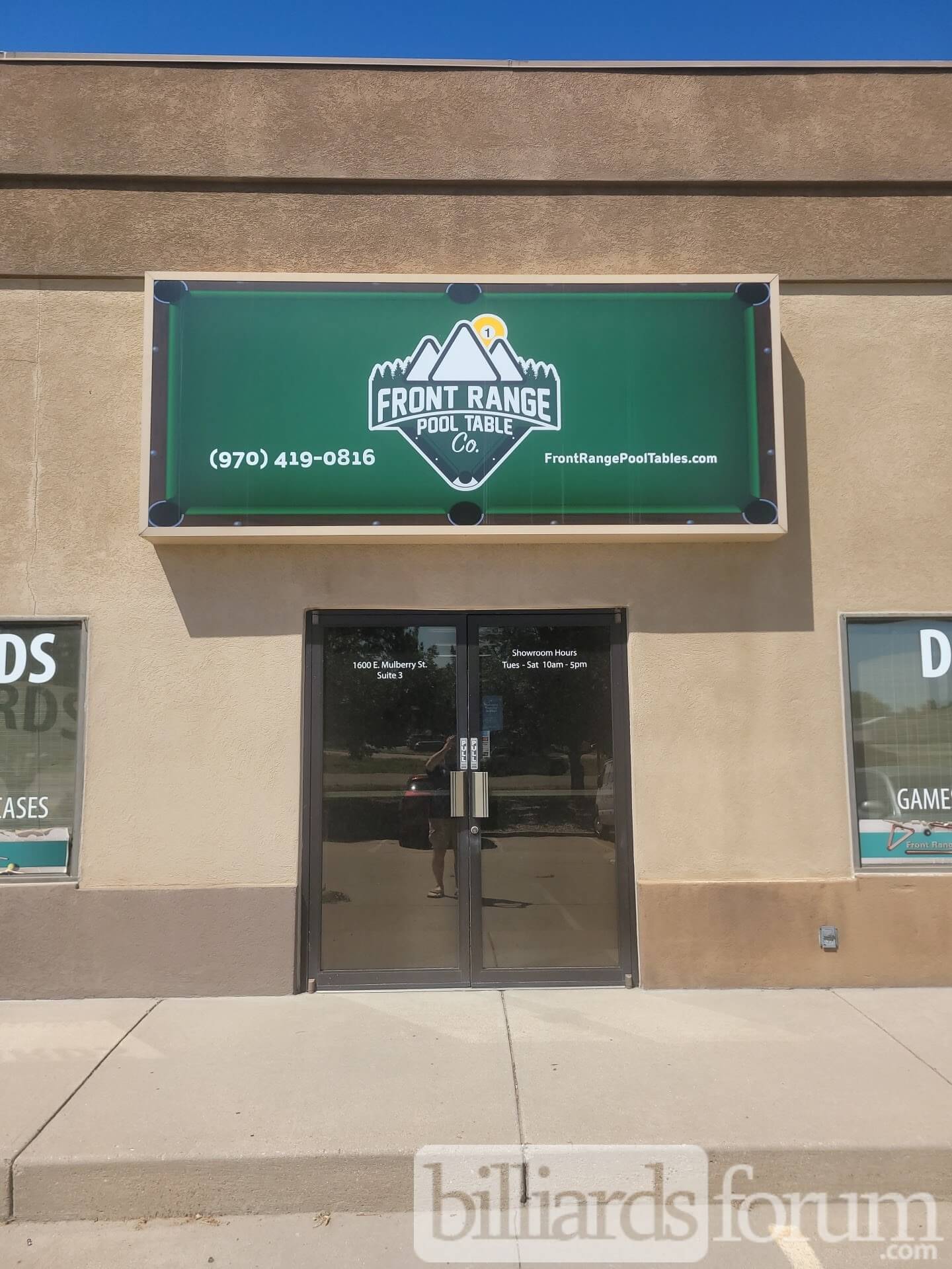 The front entrance of Front Range Pool Table Co., a billiard store in Fort Collins, CO.