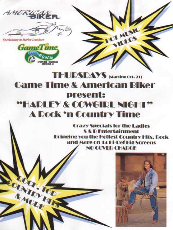 This is a flyer from Game Time Riptide in Greenville, SC showing events for Harley and Cowgirl night.