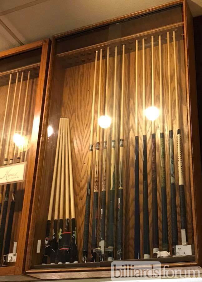 Pool cues for sale in the pro shop at ICT Pool & Billiards, a Wichita, KS pool hall.