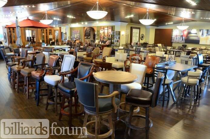 The game room table and chairs sales area inside of Peters Billiards, a billiard and game room store in Minneapolis, MN.
