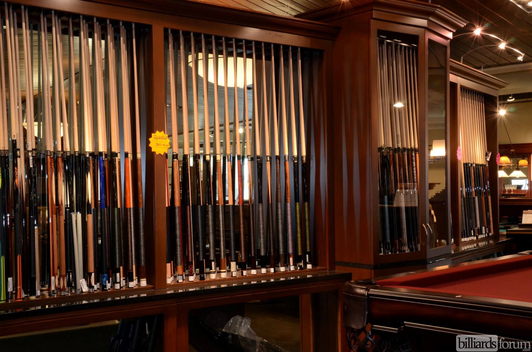 In stock pool cues at Peters Billiards, a Minneapolis, MN game room store.