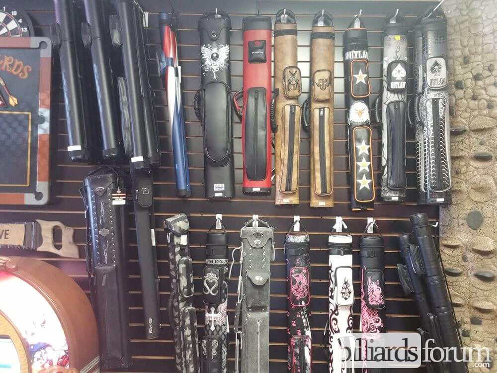 The selection of in-stock pool cues cases at Prestige Billiards Phoenix, Arizona location. The store has since moved, and the company now has locations in Glendale, Scottsdale, and Mesa, AZ.
