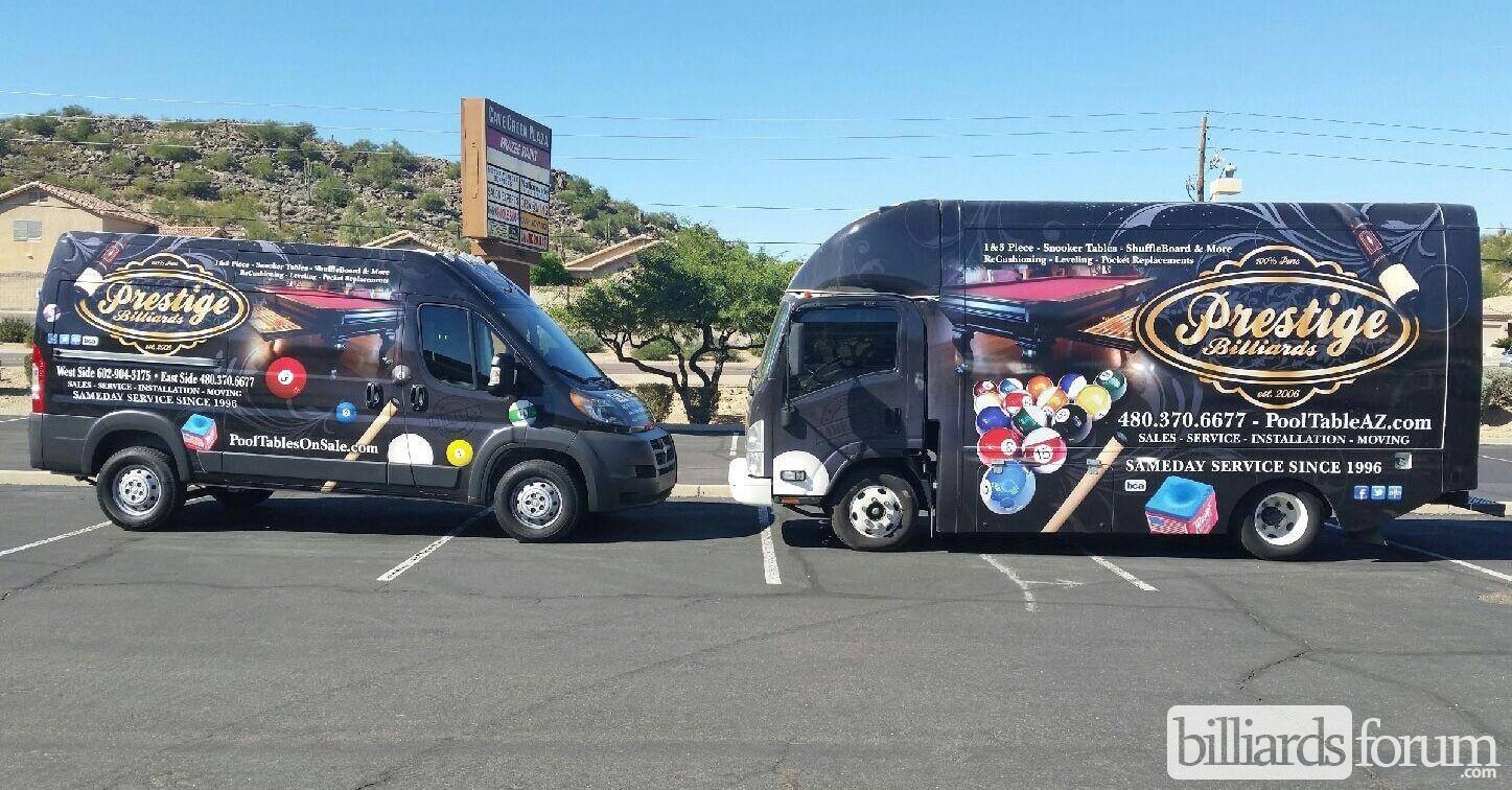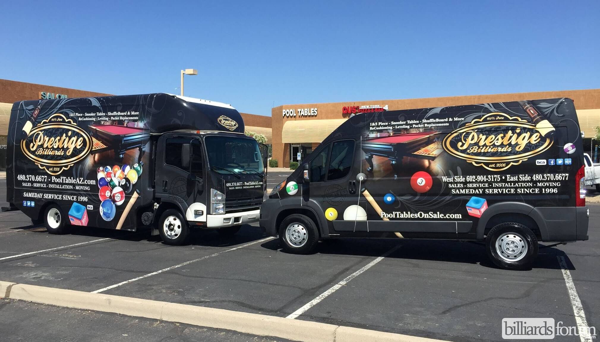 The pool table delivery trucks parked at the Phoenix Arizona Prestige Billiards location.